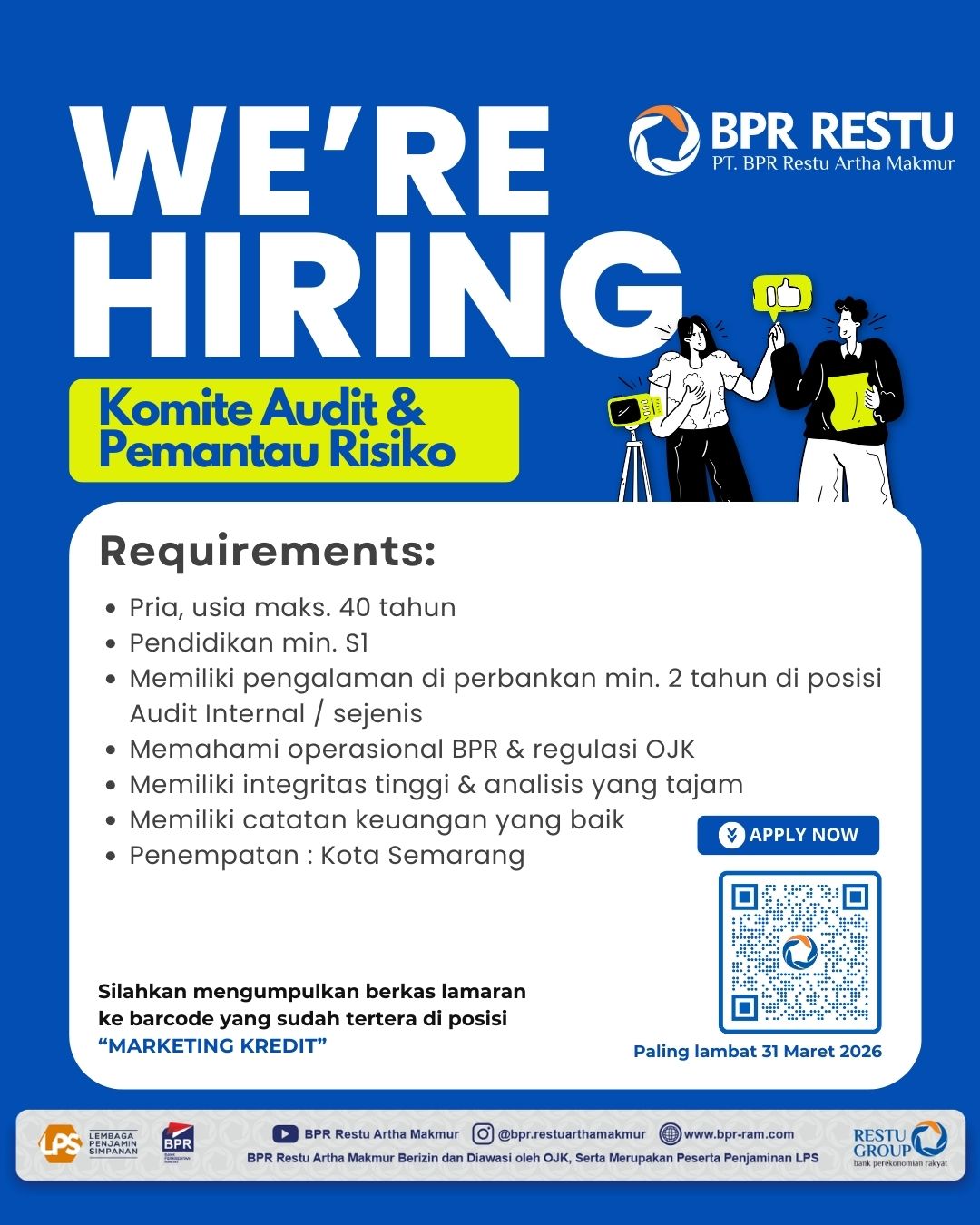 - Memiliki pengalaman di perbankan min. 2 tahun di posisi Audit Internal/ sejenis